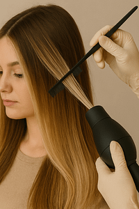 1. Sanfte Anwendung: Im Gegensatz zu traditionellen Balayage- oder Folientechniken wird bei AirTouch das Haar direkt mit einem Föhn angehoben, während die Farbe aufgetragen wird. Dies ermöglicht eine präzise und gleichmäßige Verteilung des Farbmix.